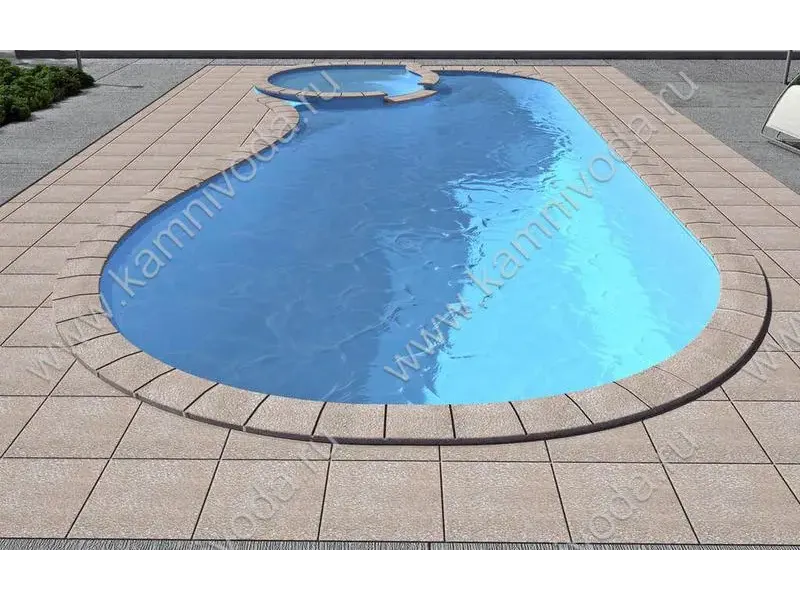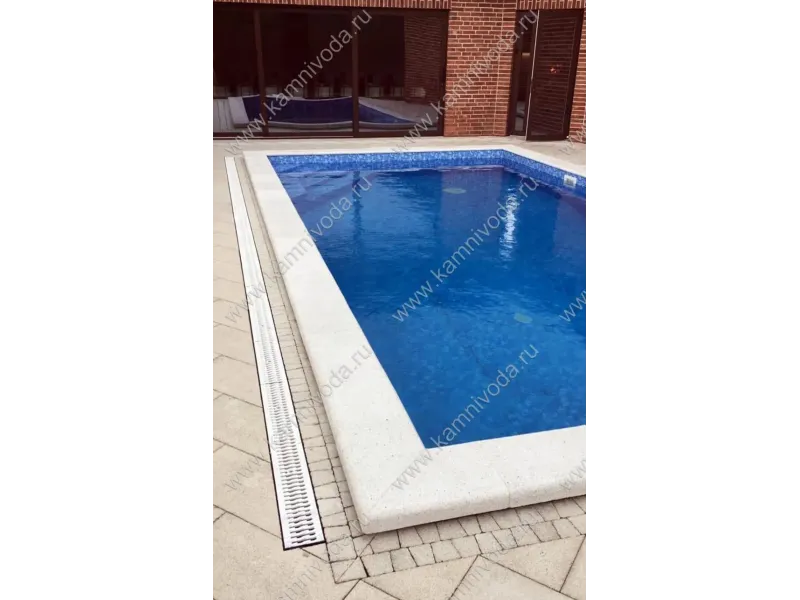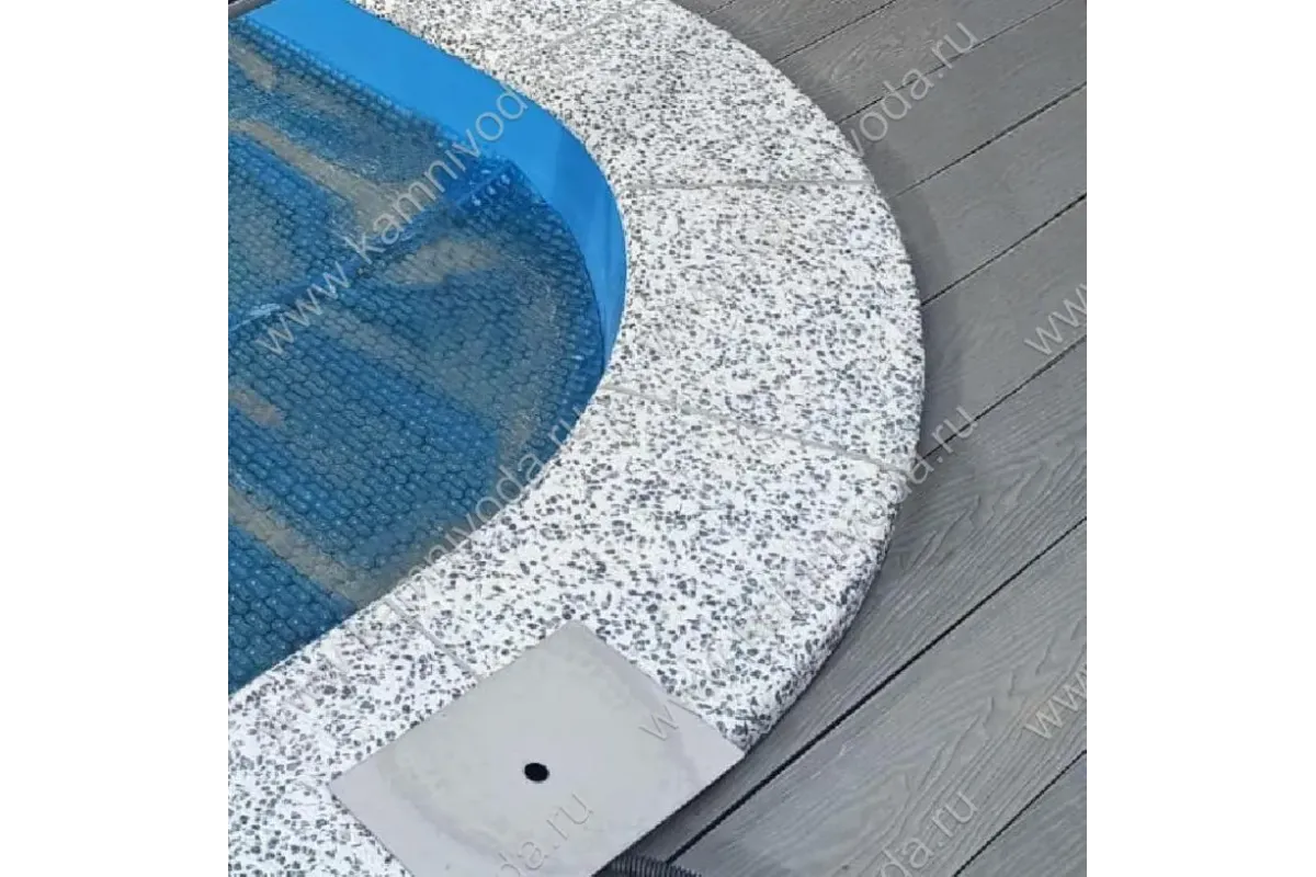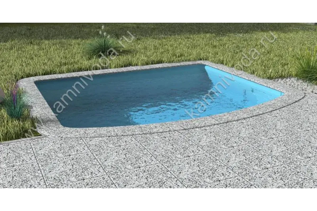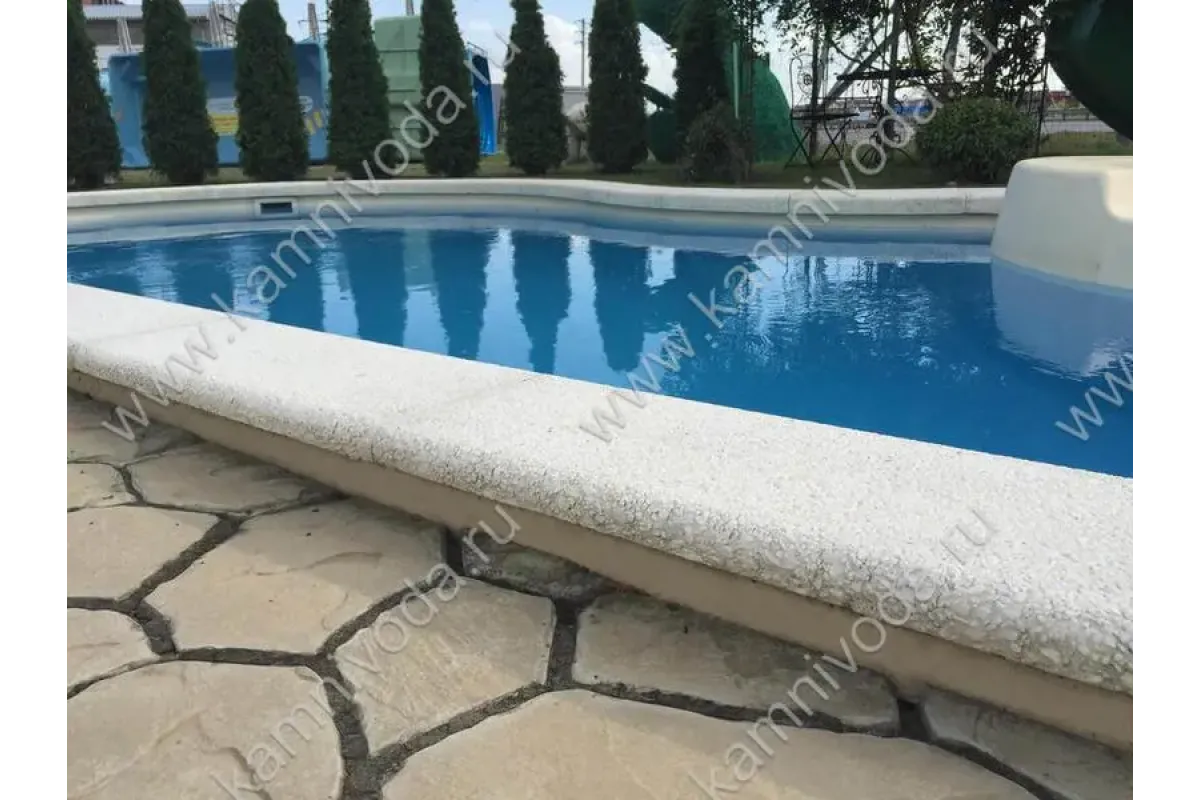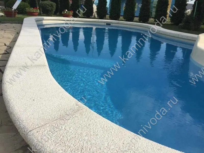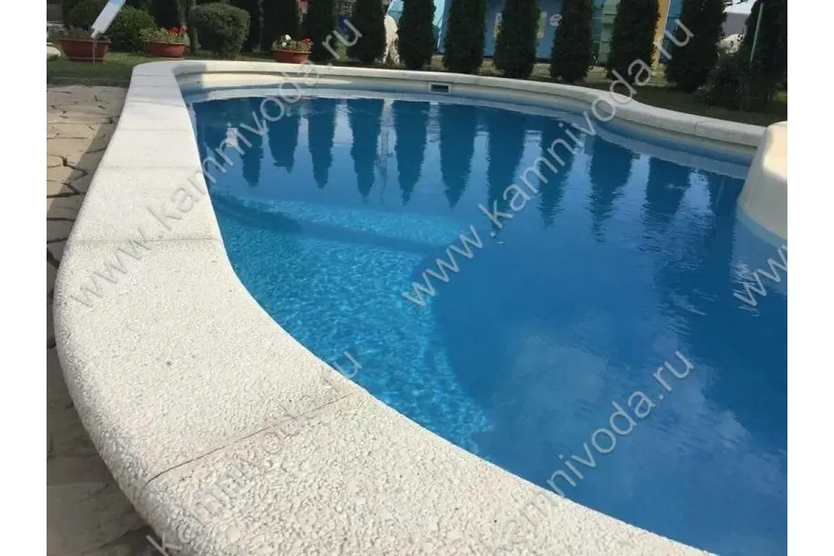 Бордюрный камень из мраморной крошки может быть изготовлен любой ширины (кроме формы "домик") и при помощи него можно окантовать бассейн любой формы. Профиль камня из мраморной крошки может быть плоский, «домик» (ширина только 320 мм.), Г-образный или П-образный, а так же террасная плитка 400*400 мм..