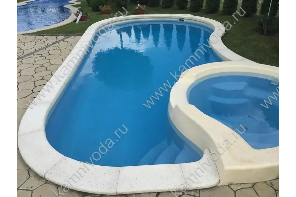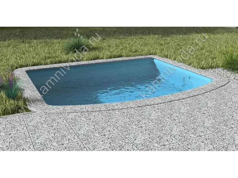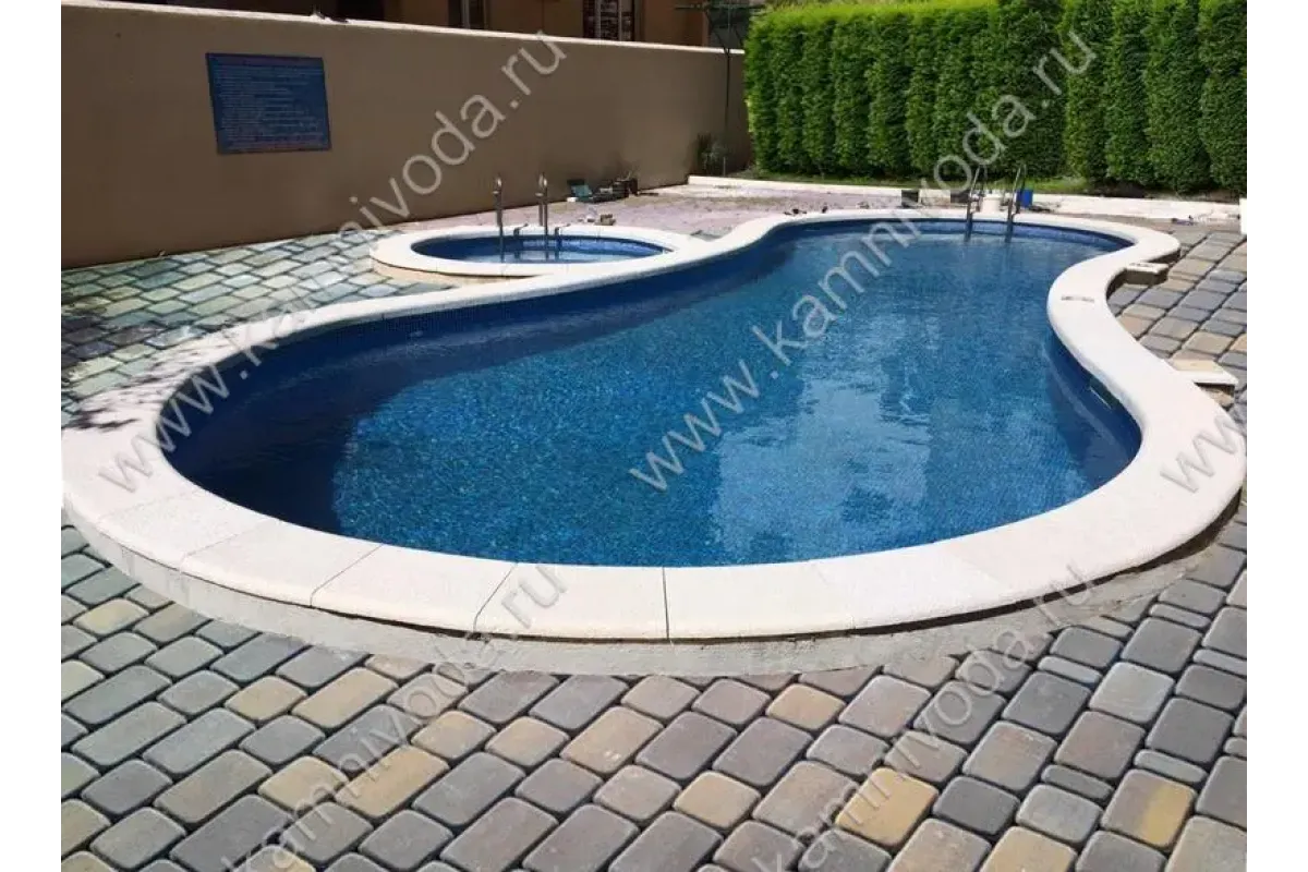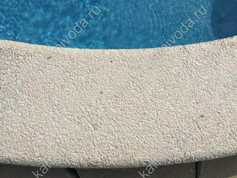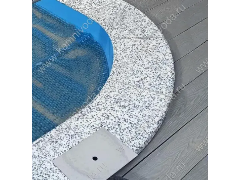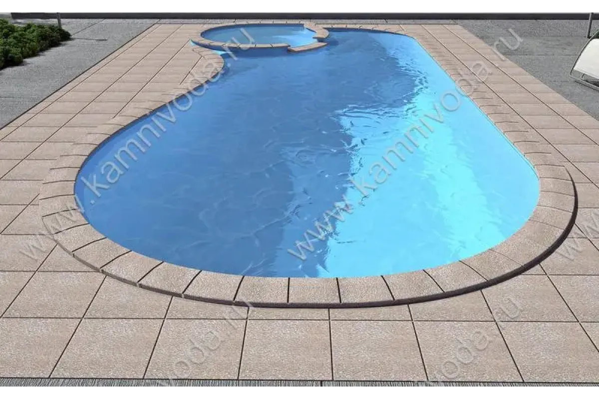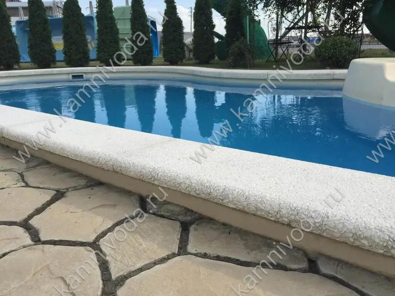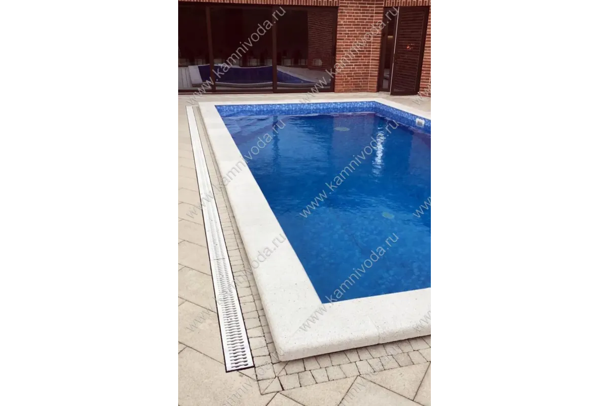 Бордюрный камень из мраморной крошки может быть изготовлен любой ширины (кроме формы "домик") и при помощи него можно окантовать бассейн любой формы. Профиль камня из мраморной крошки может быть плоский, «домик» (ширина только 320 мм.), Г-образный или П-образный, а так же террасная плитка 400*400 мм..
