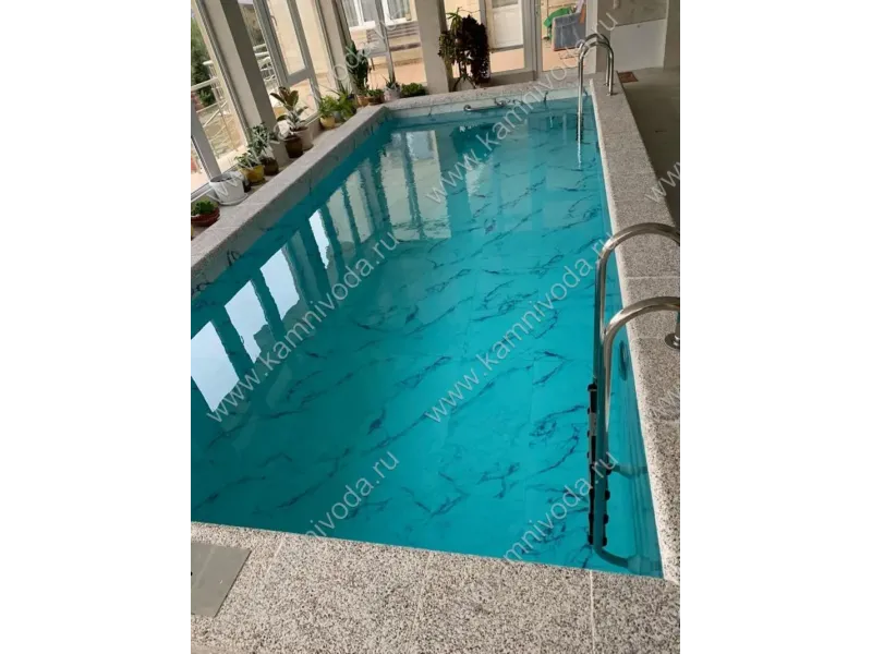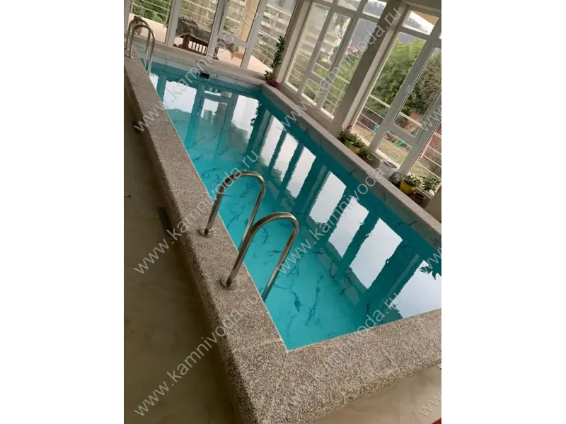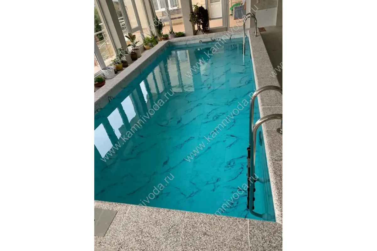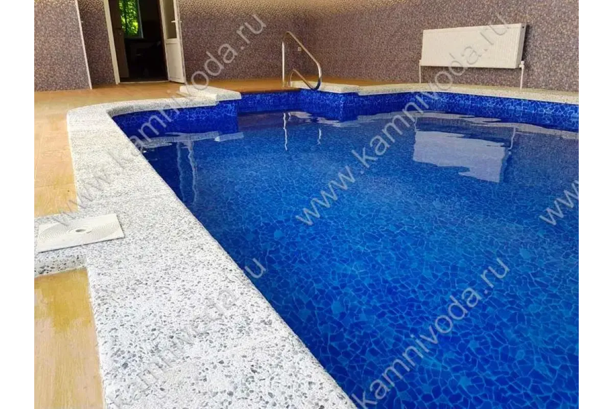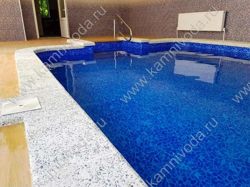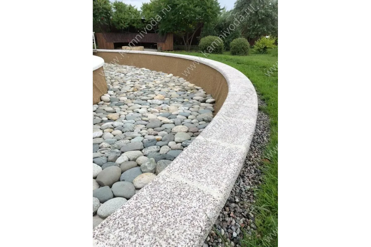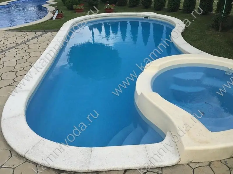 Бордюрный камень из мраморной крошки может быть изготовлен любой ширины (кроме формы "домик") и при помощи него можно окантовать бассейн любой формы. Профиль камня из мраморной крошки может быть плоский, «домик» (ширина только 320 мм.), Г-образный или П-образный, а так же террасная плитка 400*400 мм..