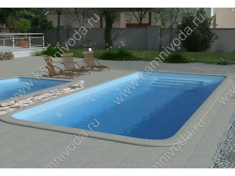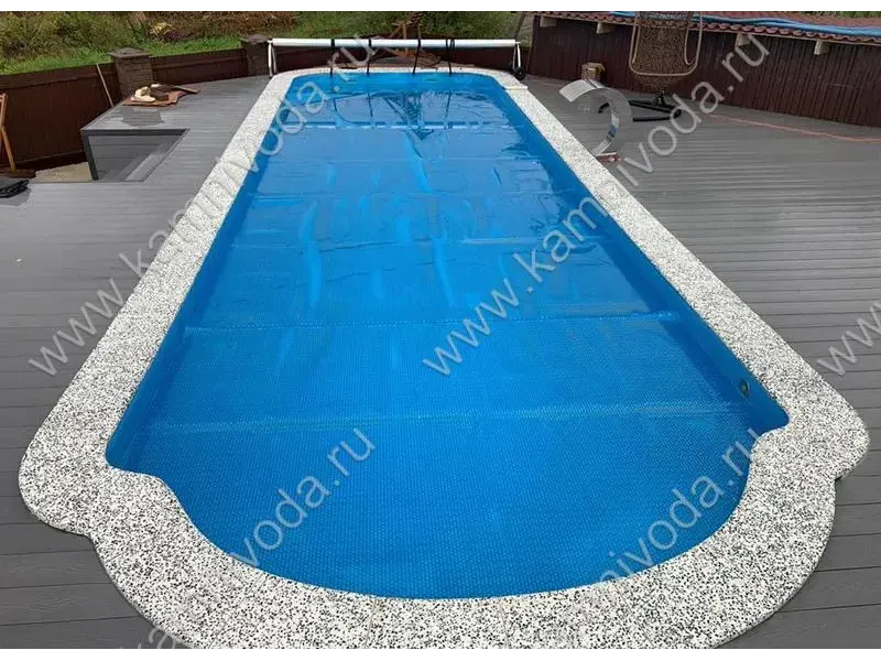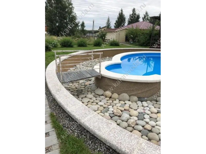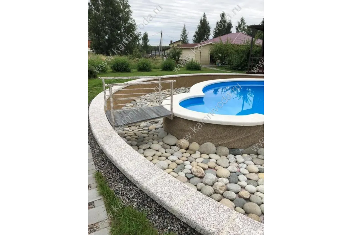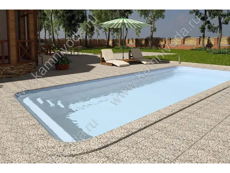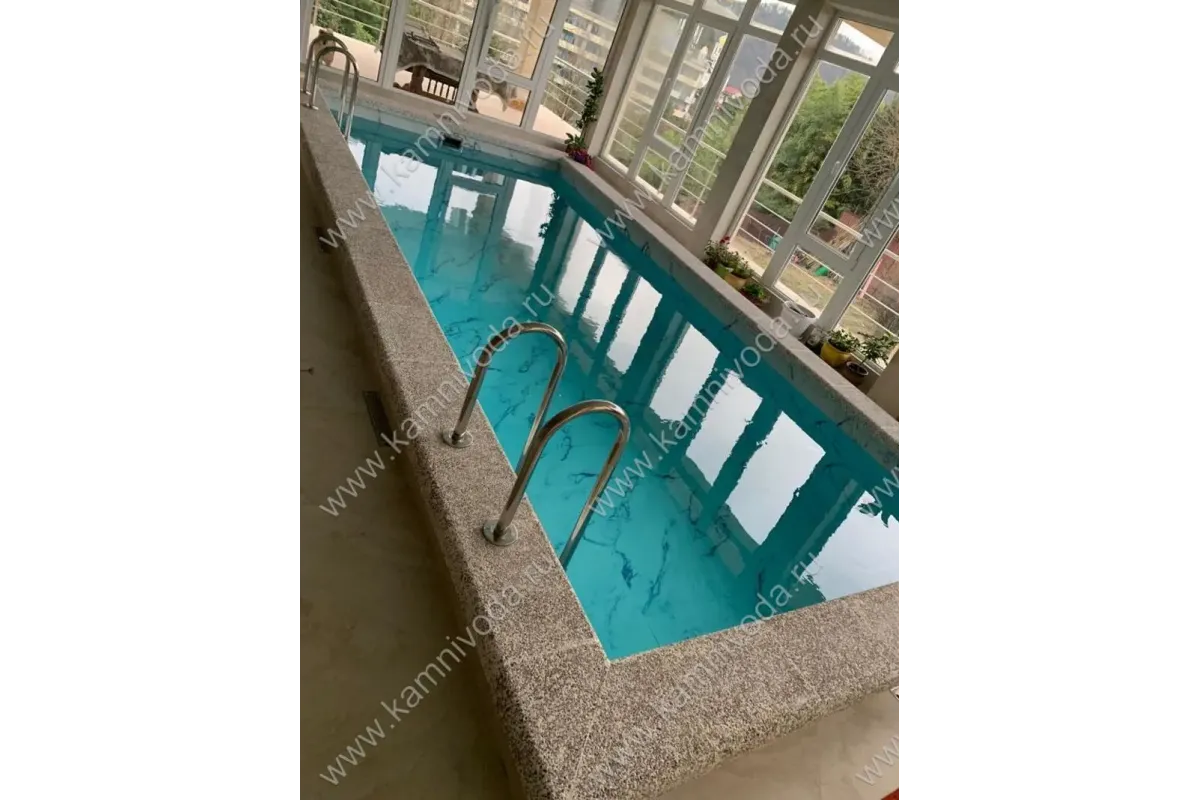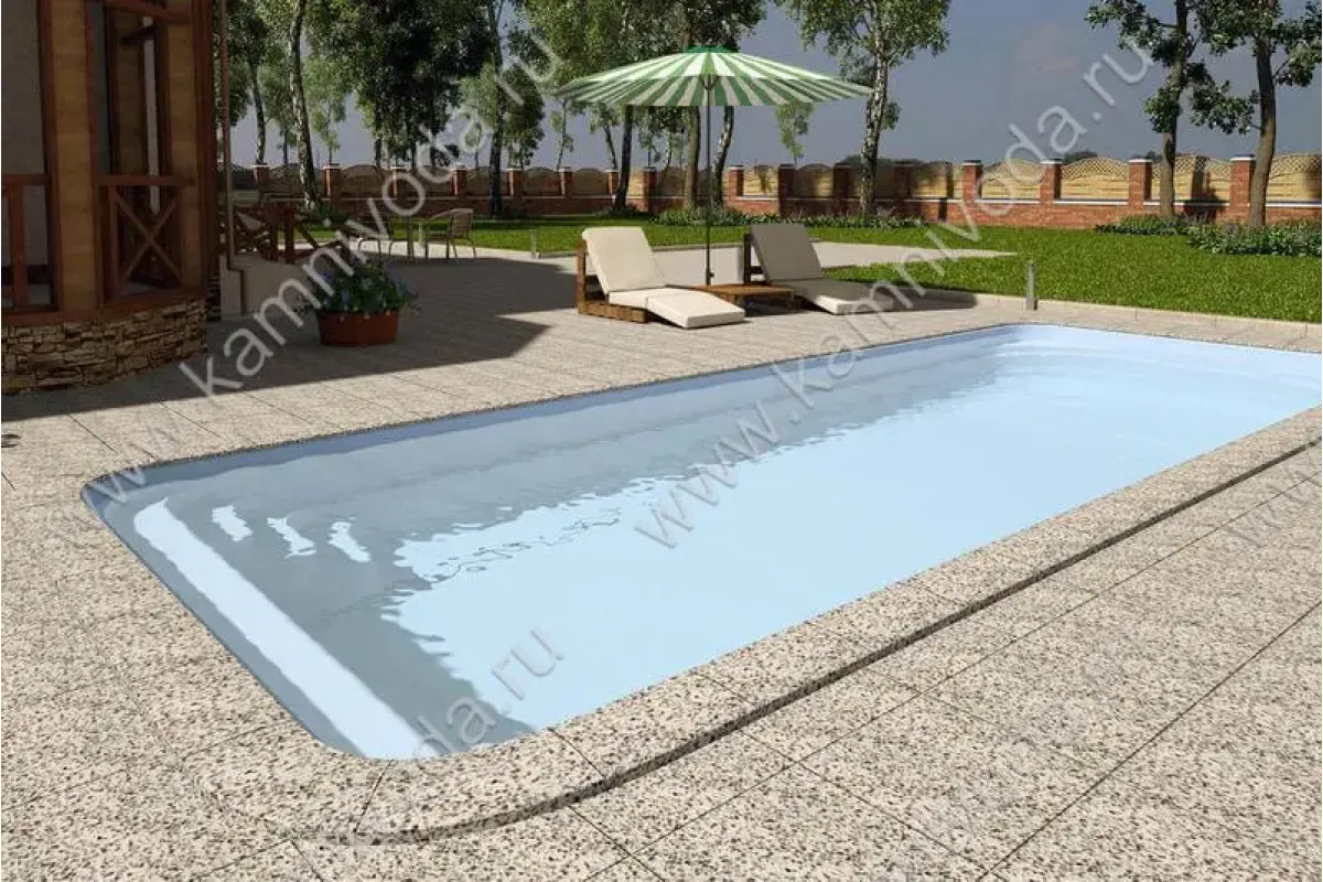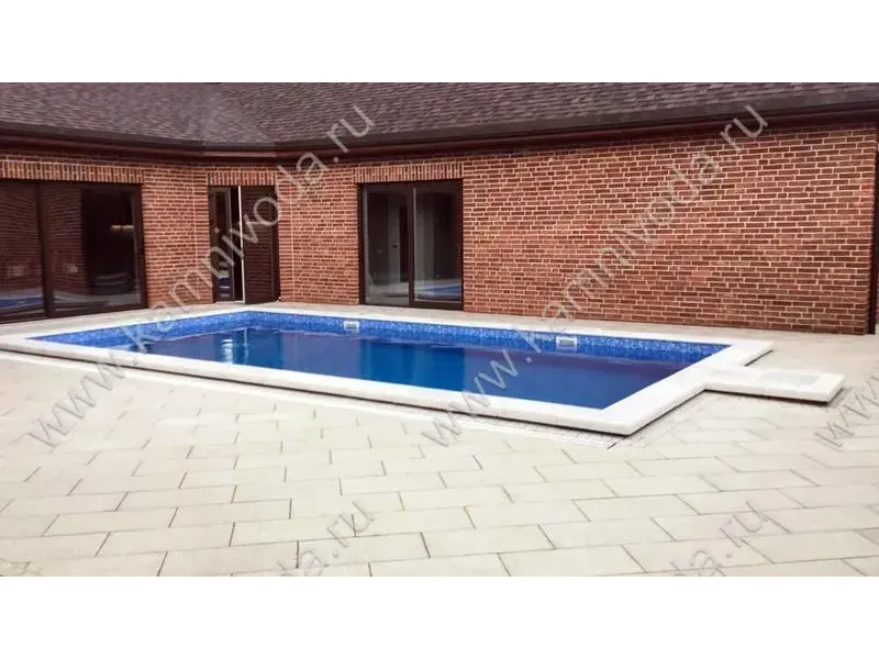 Бордюрный камень из мраморной крошки может быть изготовлен любой ширины (кроме формы "домик") и при помощи него можно окантовать бассейн любой формы. Профиль камня из мраморной крошки может быть плоский, «домик» (ширина только 320 мм.), Г-образный или П-образный, а так же террасная плитка 400*400 мм..