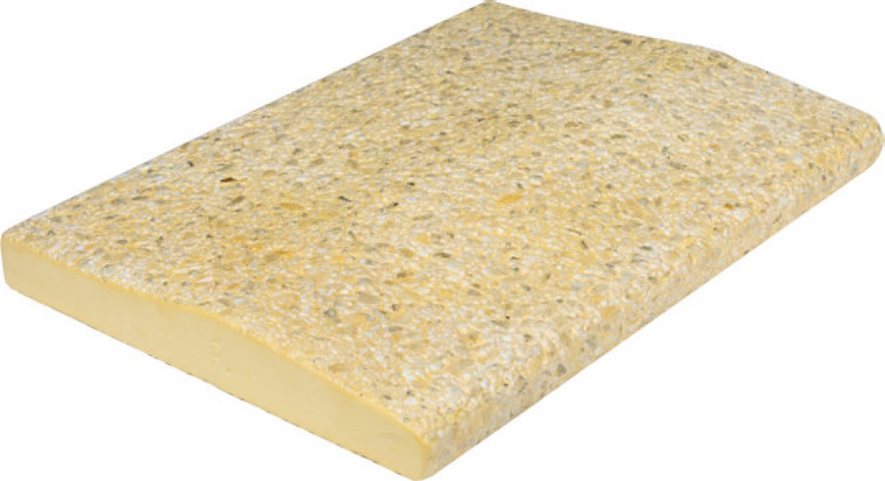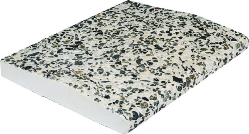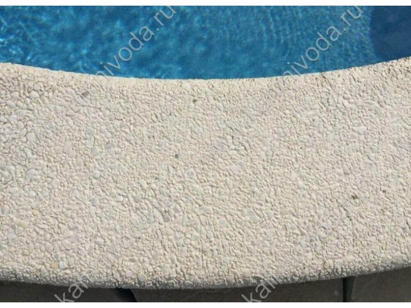 Бордюрный камень из мраморной крошки является наиболее распространенным вариантом отделки бортика бассейна благодаря своей невысокой стоимости и практичности в процессе эксплуатации. Лицевая часть камня представляет собой слегка шероховатую поверхность, при этом отсутствие острых частей исключает возможность получения чувства дискомфорта при ходьбе по камню, а наоборот доставляет определенное удовольствие и имеет место массажный эффект. При производстве камня из мраморной крошки используются только натуральные природные материалы.