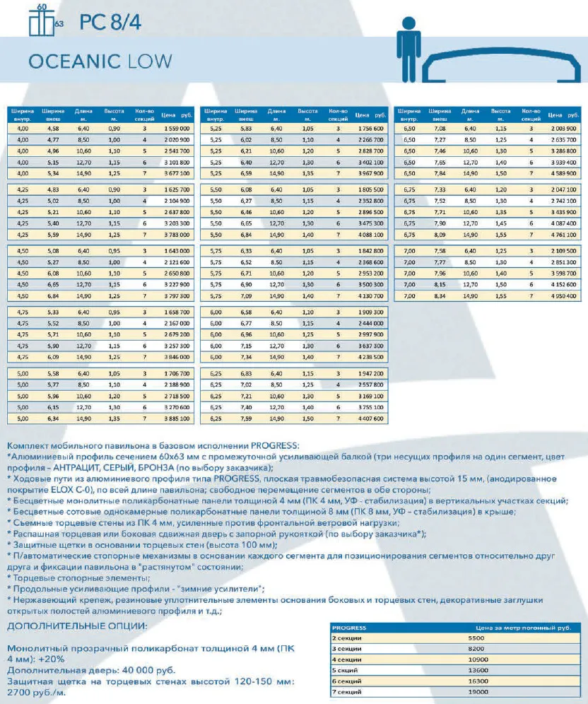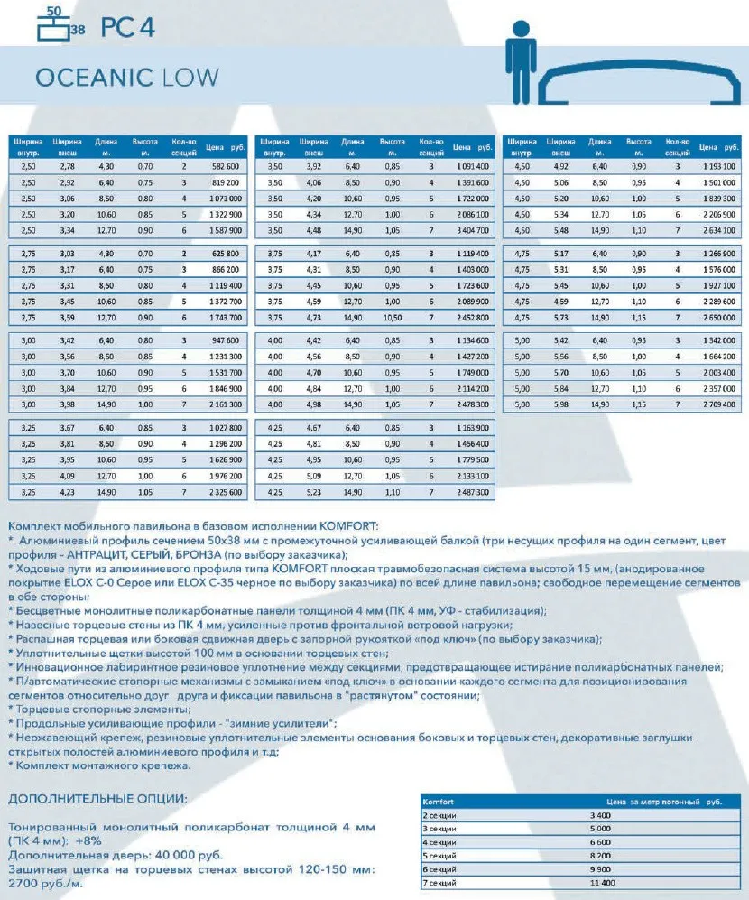 Цены на базовые размеры павильона Oceanic Low, IPC (без учета скидки в размере 10%):