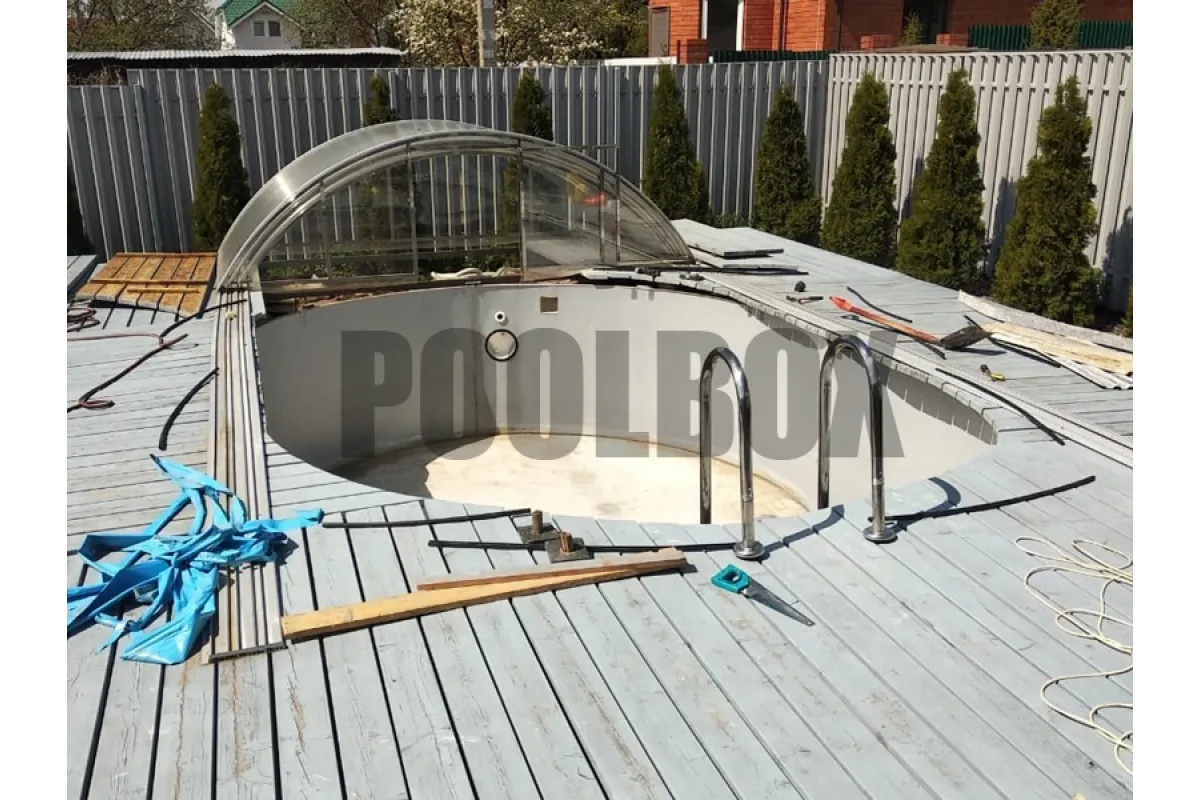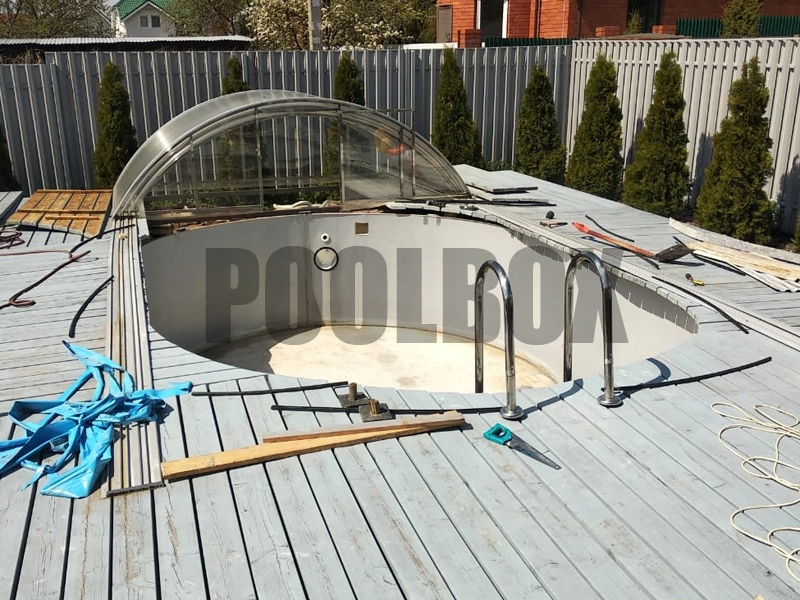 Основной недостаток каркасного (сборно-разборного) плавательного бассейна является недолговечность вкладыша из пленки ПВХ (чашковый пакет) и высокая вероятность его повреждения в процессе эксплуатации бассейна. В качестве альтернативы использования чашкового пакета является отделка каркаса пленкой ПВХ толщиной 1,5 мм. В данном случае была использована пленка ПВХ Aquaviva 1,5 мм. blue, срок эксплуатации которой составляет не менее 15 лет.