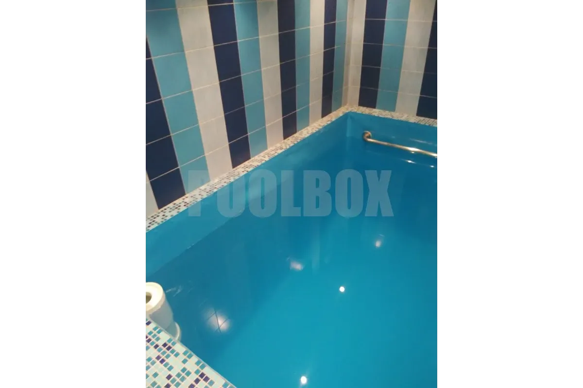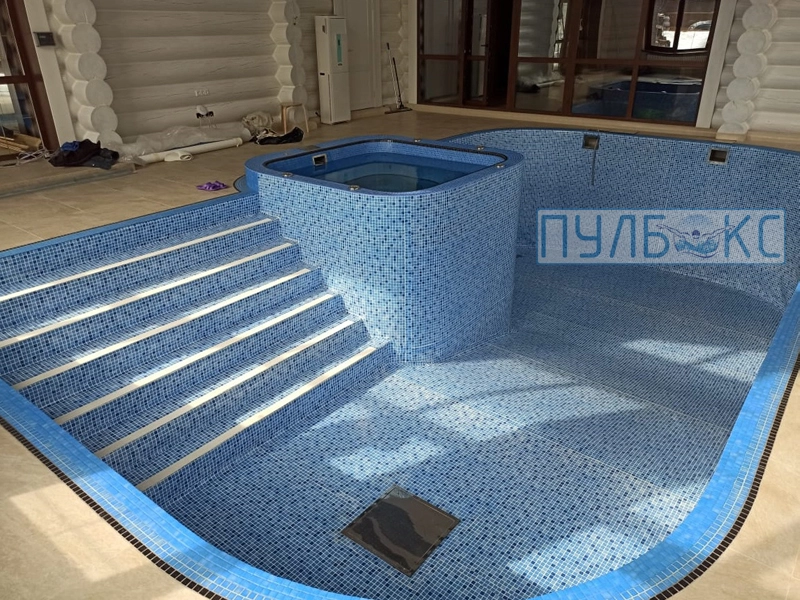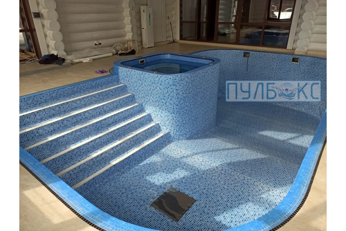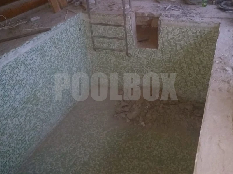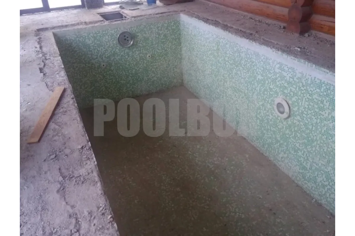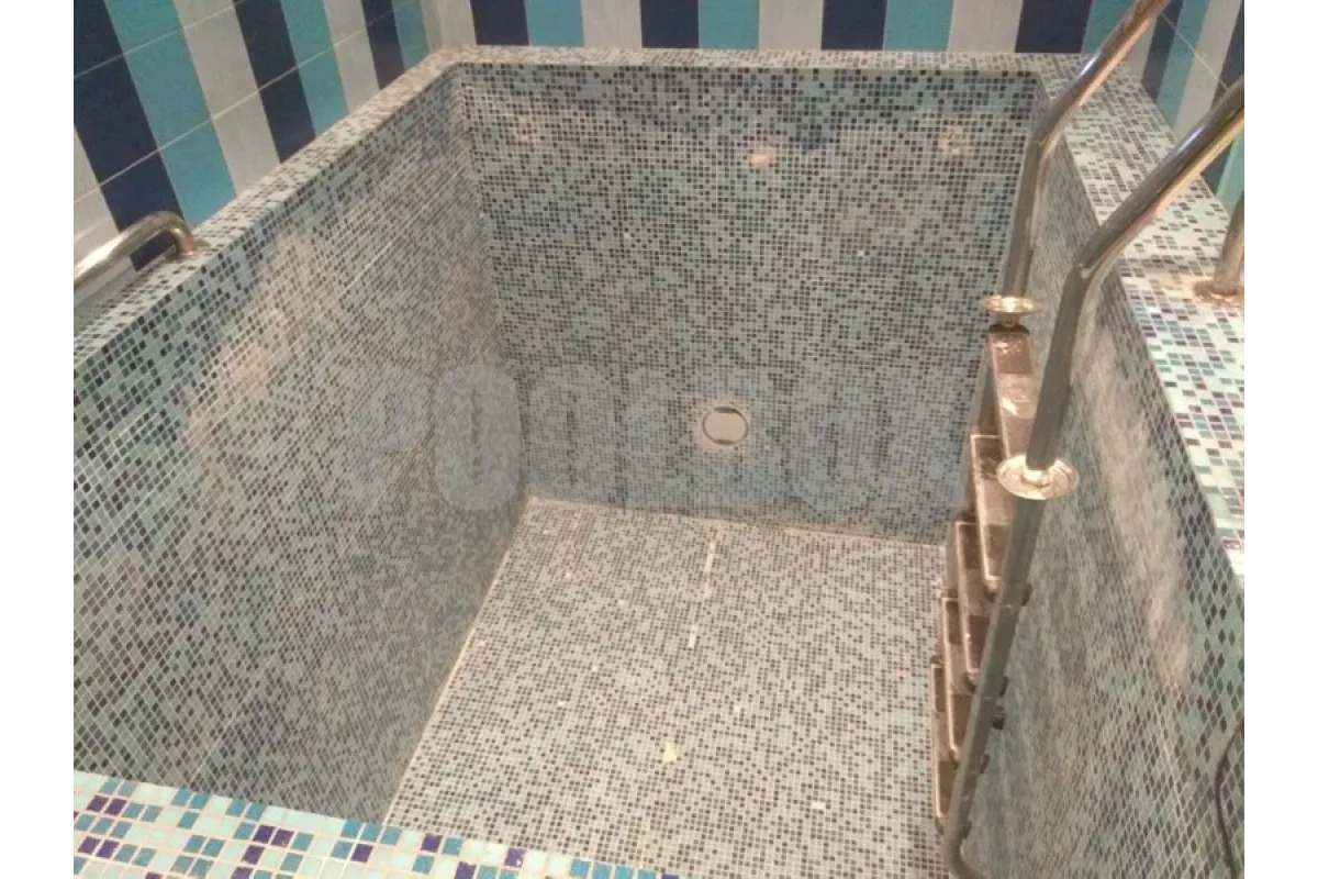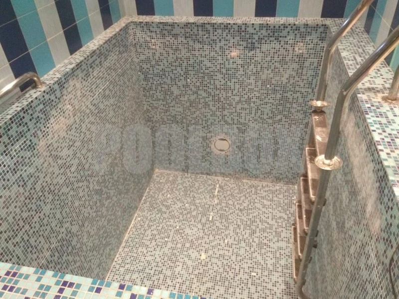 По причине высокой степени износа стеклянной мозаики в купели 2,5*2,0 м. была произведена затирка швов между мозаиками для формирования ровной плоскости бортов и дна бассейна с последующей отделкой чаши купели испанской пленкой ПВХ Cefil France 1,5 мм.
