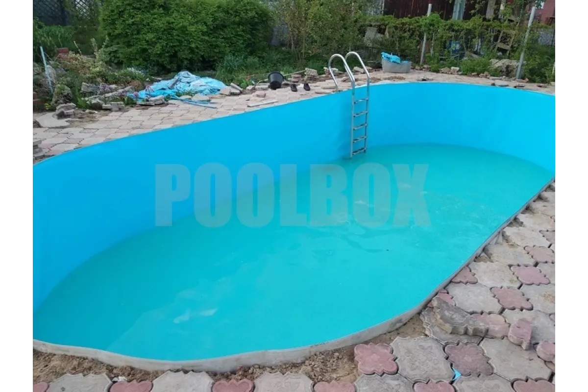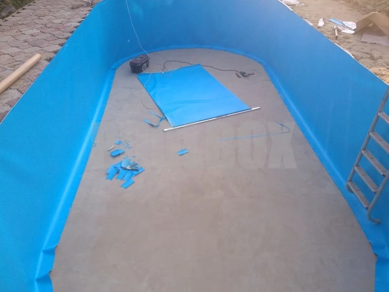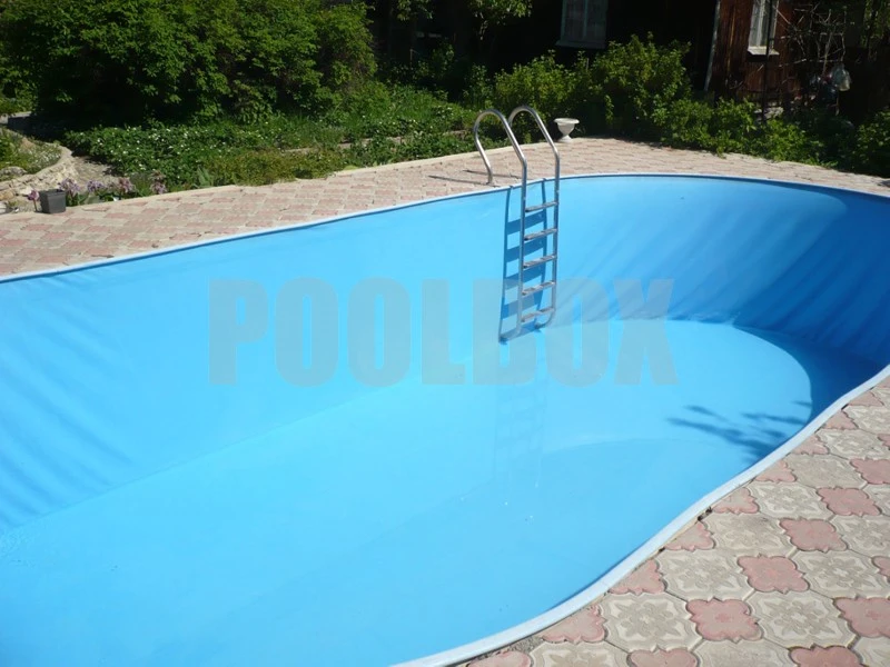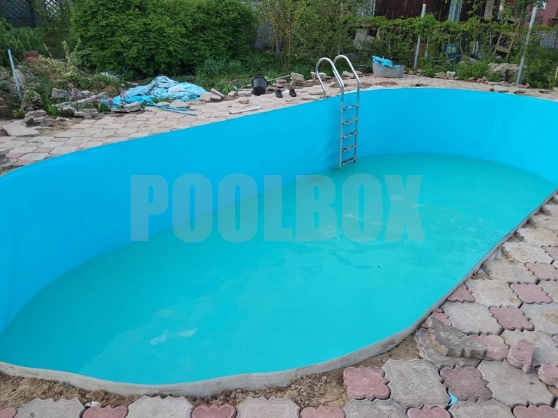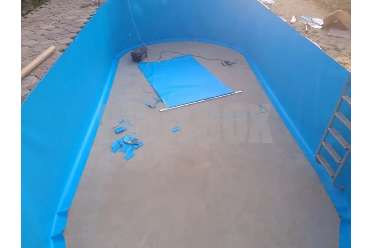 Основной недостаток каркасного (сборно-разборного) плавательного бассейна является недолговечность вкладыша из пленки ПВХ (чашковый пакет) и высокая вероятность его повреждения в процессе эксплуатации бассейна. В качестве альтернативы использования чашкового пакета является отделка каркаса пленкой ПВХ толщиной 1,5 мм. В данном случае была использована пленка ПВХ Aquaviva 1,5 мм. blue, срок эксплуатации которой составляет не менее 15 лет.