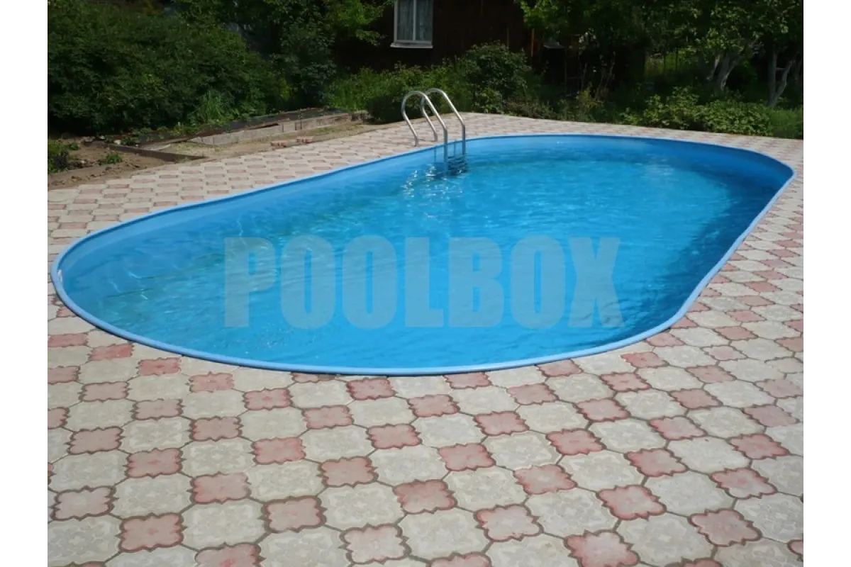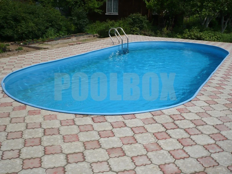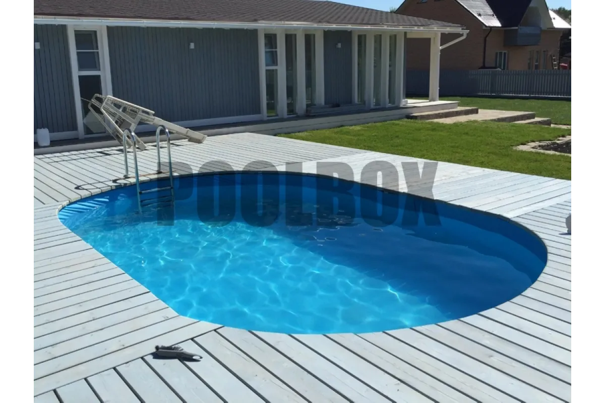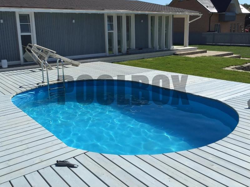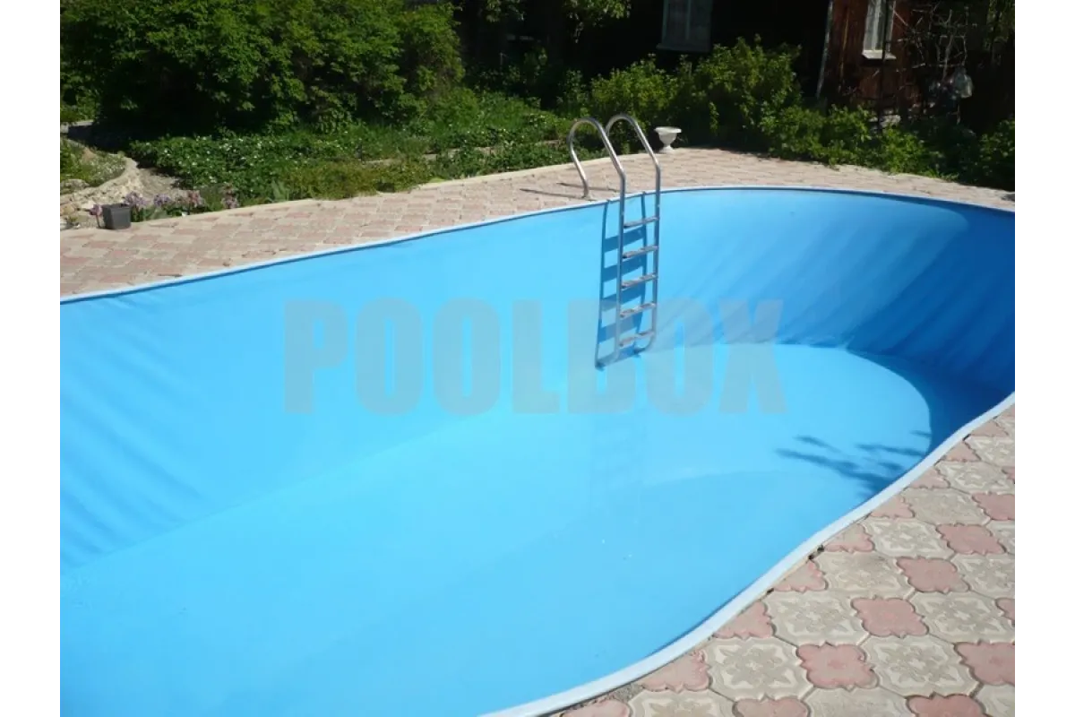 Основной недостаток каркасного (сборно-разборного) плавательного бассейна является недолговечность вкладыша из пленки ПВХ (чашковый пакет) и высокая вероятность его повреждения в процессе эксплуатации бассейна. В качестве альтернативы использования чашкового пакета является отделка каркаса пленкой ПВХ толщиной 1,5 мм. В данном случае была использована пленка ПВХ Aquaviva 1,5 мм. blue, срок эксплуатации которой составляет не менее 15 лет.