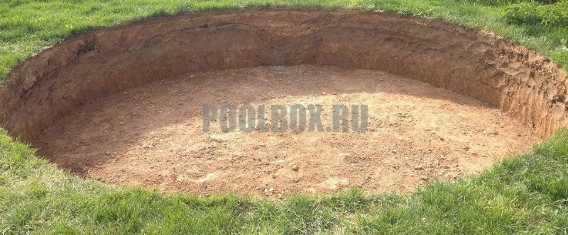 Изготовление котлована под каркас бассейна. Глубина котлована рассчитывается на 30 см. ниже предполагаемого уровня дна бассейна. Ширина и длина котлована рассчитывается на 1 м. больше с каждой стороны с учетом поддерживающих подпорок прямого участка борта бассейна (в случае с овальными бассейнами Эсприт Биг) либо выступающих балок (в случае с овальными бассейнами Гибралтар).